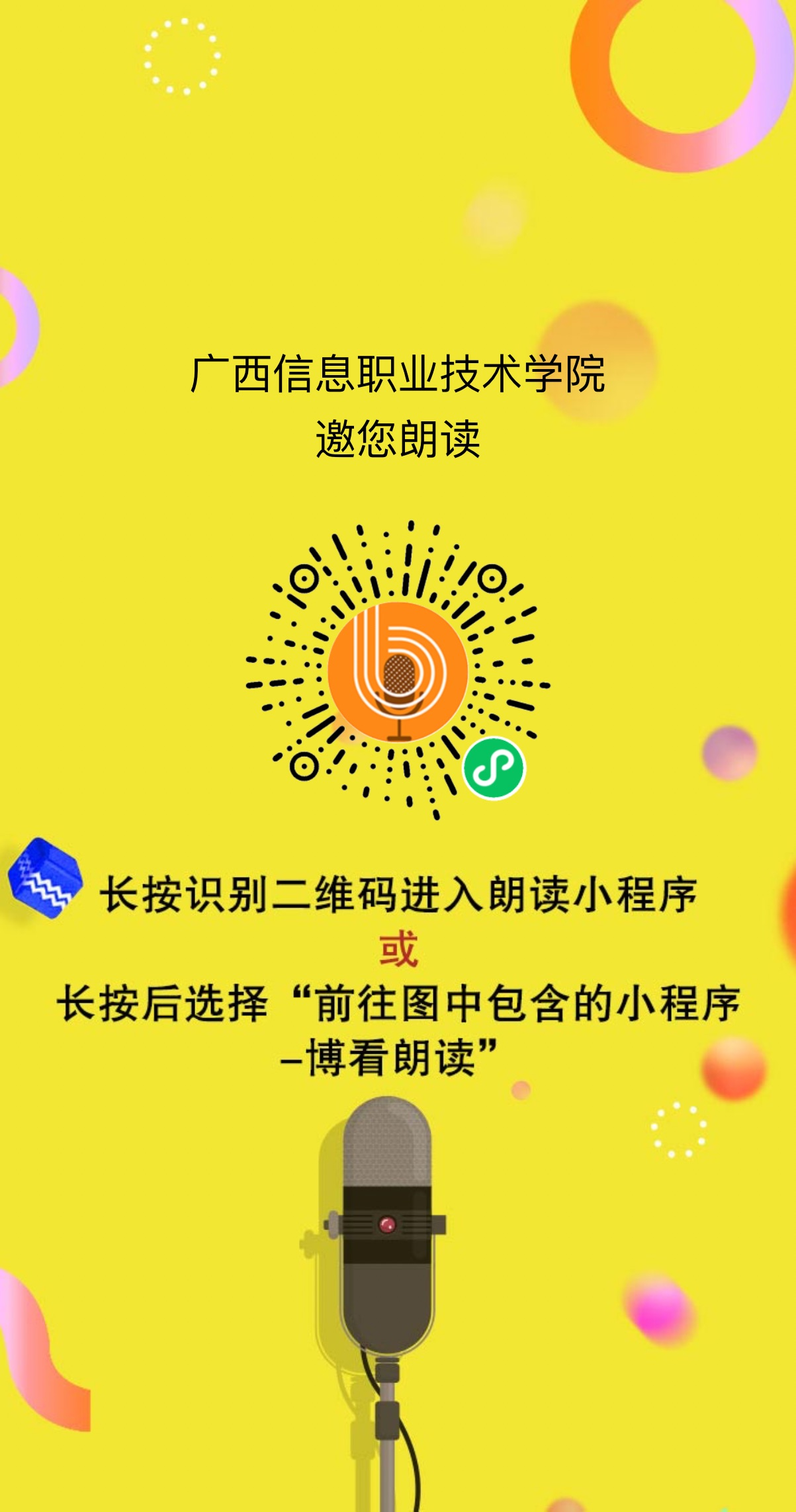 (一)博看朗读小程序报送:可用博看朗读小程序链接(https://miniapp.bookan.com.cn/?id=63317)或直接扫码进入博看朗读小程序完成参赛作品的录制,录制完成后通过朗读小程序大赛专题页面报名并上传参赛作品。