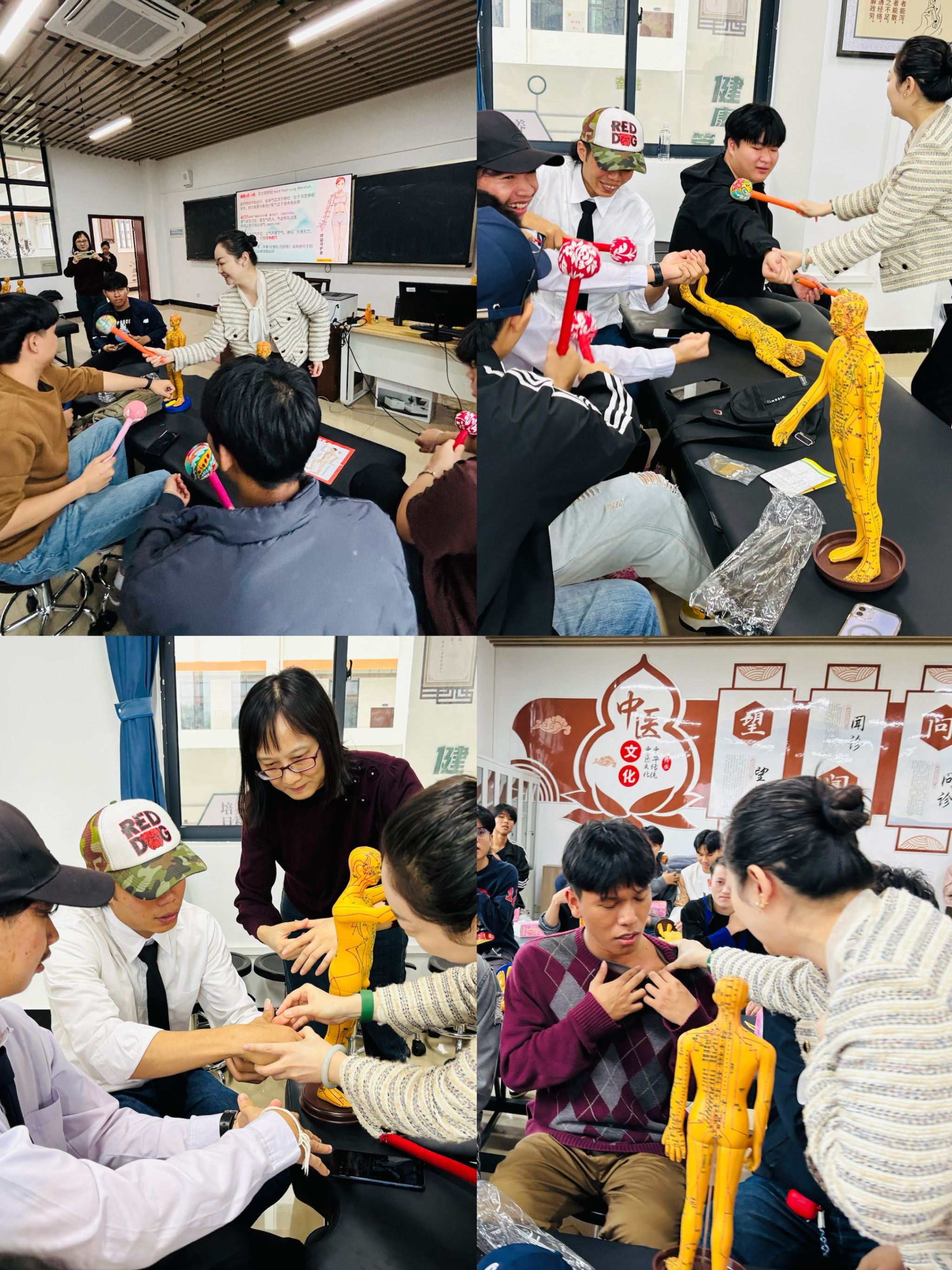 本次研学培训由通识教育学院组织。来自泰国、老挝的国际学生在研学中亲身感受了中医的魅力和东方养生文化的独特价值,国际学生们不仅收获了中医健康养生知识,还学习实践了中医穴位推拿技能,亲身体验中医文化的博大精深,两校师生在交流中建立起真挚友情。我校《健康管理》专业教学团队黄晶老师不仅从中医传统文化的角度切入,详细解读了腧穴、经络等知识,还通过实际操作展示,生动地呈现了中医养生保健的独特魅力。国际学生们还一一体验了中医治愈身心的传统疗法,纷纷对其神奇的疗效赞不绝口。