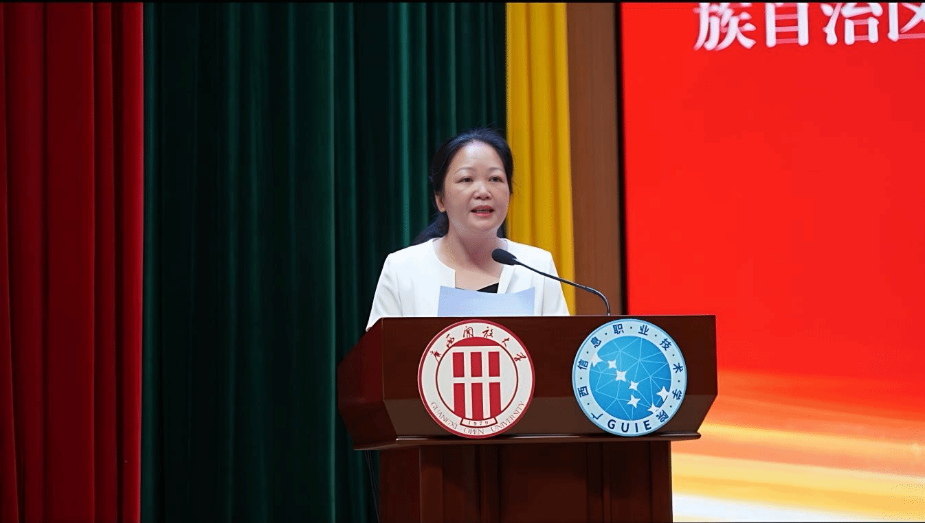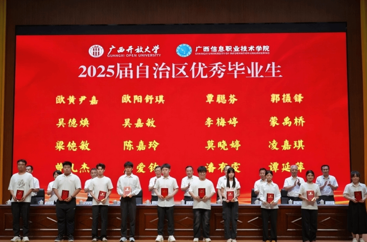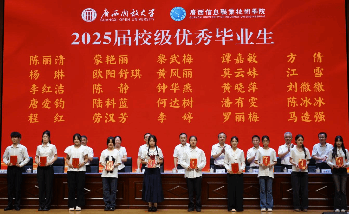 求学的过程是师生双向奔赴的接力,每一份闪耀的成绩背后,都凝聚着师生的智慧与汗水。龙雪津宣读《自治区教育厅关于认定2025届广西壮族自治区普通高等教育优秀毕业生的通知》《广西信息职业技术学院关于表彰2025届校级优秀毕业生的决定》,学校覃聪芬等27名同学获得2025届“自治区优秀毕业生”荣誉称号、卢梦莹等181名同学获得学校“2025届优秀毕业生”荣誉称号。